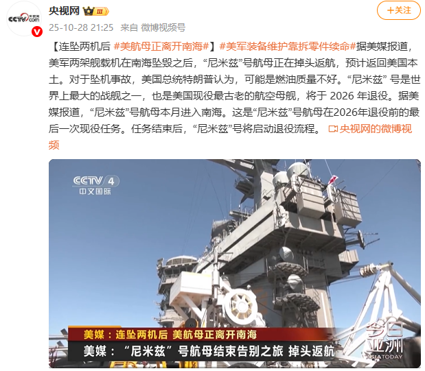 据央视微博新闻报道,美国媒体报道称,美国两架舰载机在南海坠毁后,尼米兹号航母正掉头返回美国。对于此次事故,美国总统特朗普认为可能是燃油质量较差。尼米兹号是世界上最大的军舰之一,也是美国最古老的现役航空母舰。计划于2026年退役。据美国媒体报道,尼米兹号航母本月进入南海。这是尼米兹号航母在2026年退役前的最后一次现役任务。完成任务后,尼米兹号将开始退役程序。李依林吉编辑